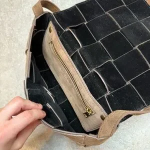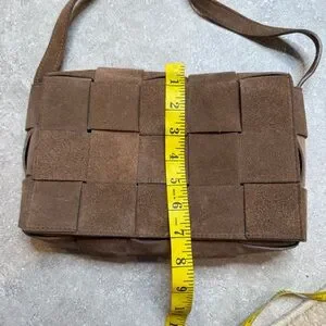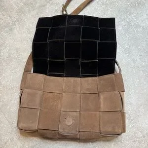 In good used condition. Definitely has some wear at the suede. Looks like the bottega woven flap bag!