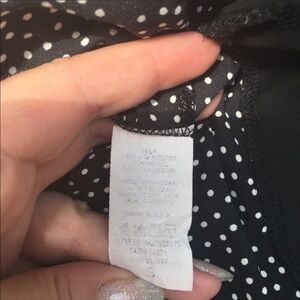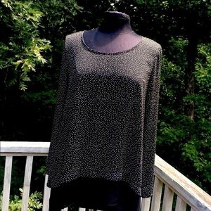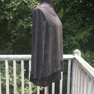 Tiny polka dots in white on a black background, long sleeve chiffon style layered him tunic by Pleione size S. Buttons at arm cuffs small slit in call him for easy movement and comfort. Lightweight loose and flowy pair with legging and flats for easy weekend day jeans for everyday or pencil skirt and heels for workday. No flaws.