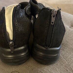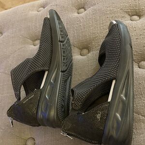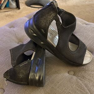 Comfortable JBU sandals with open-toe design. Stylish black and gray pattern. Ideal for casual outings. Women’s size 12W in very good condition. Zip back closure. Black soft sole wedge, very comfortable. Freeing space to purchase a new pair.