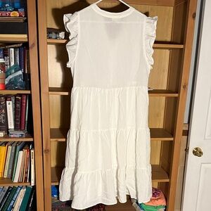Chic white dress with ruffle sleeves. Lightweight and stylish. Underarm measurement 22.5 length 45.5 inches.