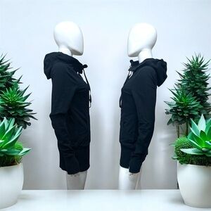 Lululemon Black Zip Up Jacket [1340]. Size 8. Black long length zip up with embroidered Lululemon symbol on hood. Drawcord, front pockets, thumbholes. Approx 28” long, 18” armpit to armpit, 15.5” across waist, 17” across hem, 27” shoulder seam to cuff. Very good pre-owned condition with minor fading at cuffs and minimal wear. There is some pilling on ribbed bottom inside. Item #1340