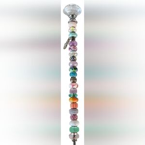 New! Set of 4 vibrant beaded plant stakes/sticks. Features multicolored beads with charms and silver accents. Perfect for adding flair to any plant pots! Color may vary due to camera lighting. Each stake is 12"-13" long.