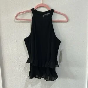 This Central Park West Tank is the perfect Little Black Tank. We love the halter style and the ruffles. Great by itself or worn layered under blazer and sweaters.
