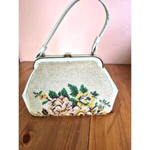 Vintage 1950s needlepoint floral shoulder bag medium size kiss lock closure