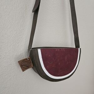 NWT (1 tag) This is an adorable all leather bag from Tudi Frudi. The watermelon shape makes it a one of a kind type piece, and the colors on it are SO nice, and would match lots of different outfits and colors. The strap is adjustable and it wears very comfortably. I've included photos with the dimensions as well as other details on the bag, so make sure to reference those. Full retail online is around $80.