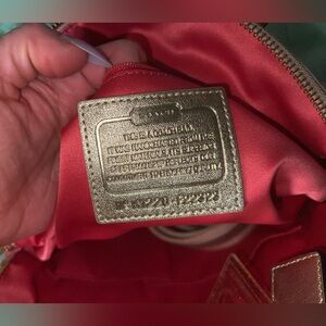 Chic Coach handbag with vibrant floral accents. Features gold hardware and signature logo pattern.