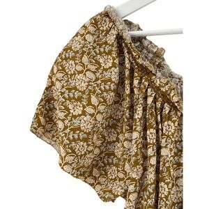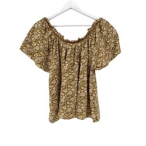 Faherty Blouse Womens Small Brown Floral Linen Blend Boho Peasant Ruffle Smocked