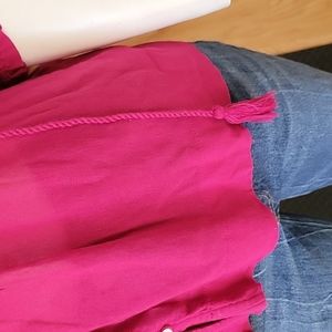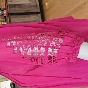 Free People Peasant Top in pink/rose with lace details on the sleeves pleating and tassel details. V-neckline with front button down closure. Pictures taken of aprox measurements.