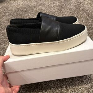 Vince slip-on sneakers, black leather sneakers, women’s minimalist shoes, Vince casual slip-ons, knit toe sneakers, black and white shoes, modern designer sneakers, comfy slip-on flats, Vince 7.5 shoes, EUC women’s sneakers