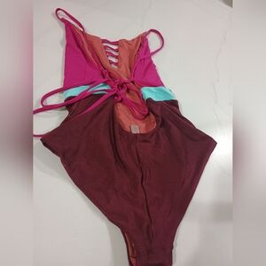 Stylish one-piece swimsuit with a vibrant colorblock design. Features pink, teal, and burgundy sections for a bold look.
