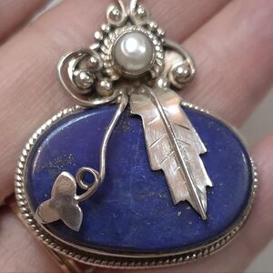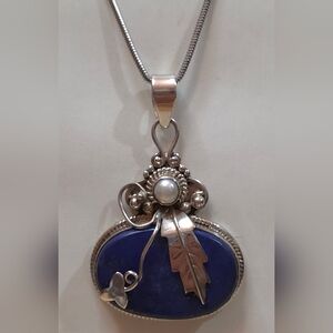 This is a beautiful vintage native american blue lapis Pendant with a genuine cultured pearl.