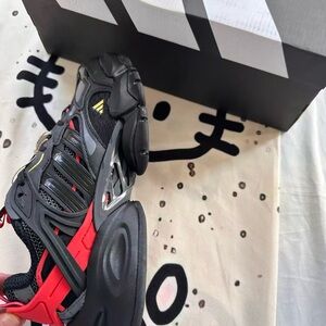Features a black and grey color scheme, with a complex and layered design that blends athletic functionality with trendy deconstructed style.