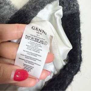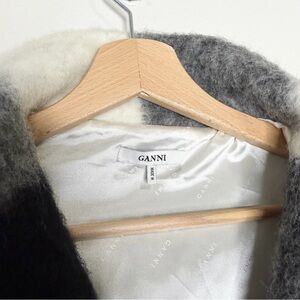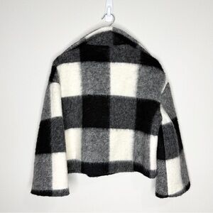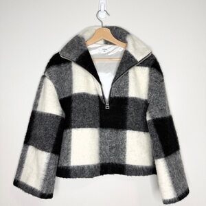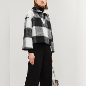 Chic and cozy GANNI McKinney wool blend jacket in a classic black, white, and grey check plaid. Features a modern half-zip neckline, cropped silhouette, and softly brushed texture for effortless Scandinavian style. Perfect layered over knits or tees for fall and winter.