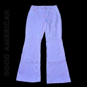 Style Tags: Good American, Good Legs, Flare Jeans, High Waisted, Pink Denim, Rose Quartz, Stretch, Flat Tummy Tech, Bootcut, Designer Jeans