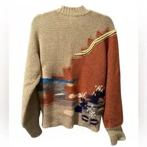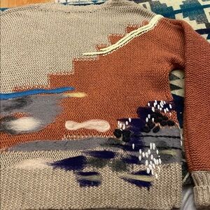 This unique wool blend sweater adds a little bit of coziness and flare to your wardrobe, featuring abstract Southwest / Art Deco designs, wool felting, applique and embroidery in stylish earth tones. A little pilling—to be expected for a preworn piece.