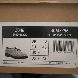Forever iconic, the archival 2046 from Dr. Martens make a comeback. Replicated, seam by seam, down to the last yellow welt stitch, this version sees a printed python suede on top of a brown Airwair® outsole - endlessly loved for its comfort and stability. Suede Uppers, Goodyear Welt, Rubber Airwair® Outsole. Dr. Martens Men's 2046 5 Eye Shoe in Sand/Black Python Print Suede