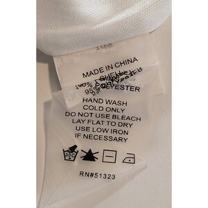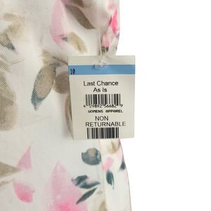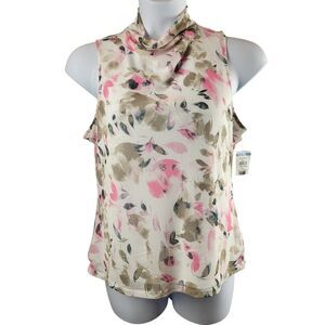 A lovely delicate look, this Vince Camuto tank top is polished with a high neckline that's stylish alone or paired with a blazer. The background is white and is sprinkled with bright pink, pale pink, and a taupe/green. Also note that the inside fabric tag is not readable. The same label from another blouse in a different size is pictured.