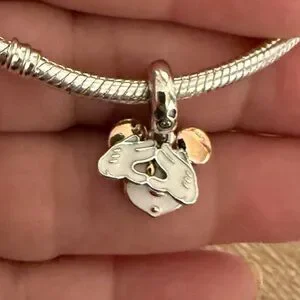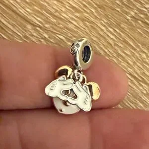 Adorable Disney charm with Mickey's face and hands. Features silver and gold tones. Ideal for Disney fans.