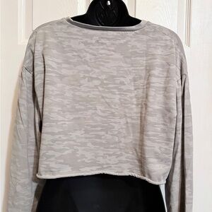 Women’s size XL Alphalete long sleeve crop top in a very good used condition. Soft gray camo color with drop shoulder and boxy crop fit.