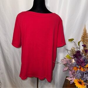 Bright and versatile Chico’s red cotton top featuring a flattering boat neckline, short sleeves, and a relaxed tunic fit for effortless comfort. Soft 100% cotton knit makes this an easy everyday piece—perfect for spring, summer, layering in fall, or adding a pop of color year-round. Great for casual, travel, work-from-home, or weekend wear. Perfect for spring basics, summer casual, fall layering, minimalist wardrobe, classic American style, capsule closet essentials.
