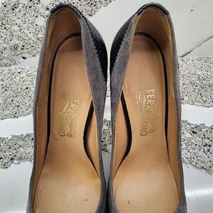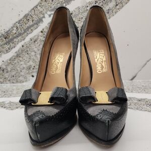 Authentic Salvatore Ferragamo Vara platform pumps, made in Italy. This pair features a spectator-inspired patchwork leather design, referencing traditional two-tone spectator shoes, reinterpreted in a feminine Vara silhouette. The upper combines gray suede panels with black pebbled leather overlays, creating a deliberate patched / paneled construction rather than a simple color-blocked shoe. Finished with Ferragamo’s signature gold Vara bow hardware at the toe, almond toe shape, high stiletto heel, and subtle platform.