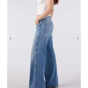 Chic light blue jeans with a wide-leg design. Perfect for a stylish look.