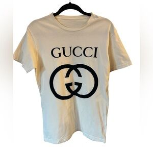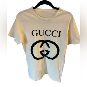 Gucci cream tee featuring a striking black emblem. Simple yet elegant.