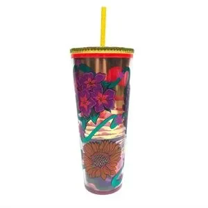It is a limited edition, collectible item released in 2024. Vibrant floral tumbler with a yellow straw. Features colorful flower designs.