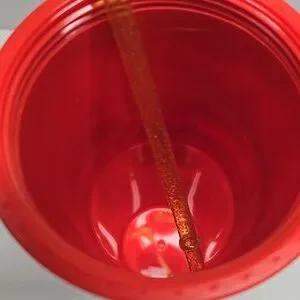 The tumbler is made of plastic with a double-wall construction and comes with a secure screw-on lid and a reusable straw.