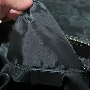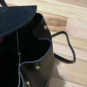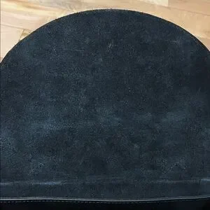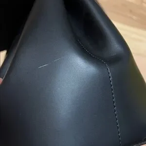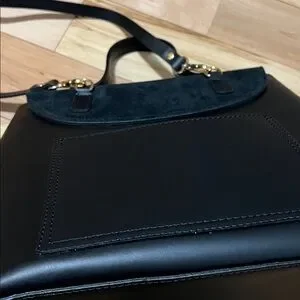 Discover the chic elegance of this black satchel, perfect for elevating any outfit. Its sophisticated design and premium material make it a versatile accessory. Super sleek and boxy making it very contemporary. The bag is in good condition. There is a white mark on the right side when facing the bag. Amazing suede and super sleek and smooth structured leather—which I am not to sure is real leather even though the tag says genuine leather. Can be hand bag, shoulder or crossbody. Loads of space and clean interior. Metal accents are in good condition the magnetic closure shows some scratches. Button closures to expand the bag. The interior is some sort of polyester material. The little pocket feels more flat may of a material. Strap and handle in great shape.