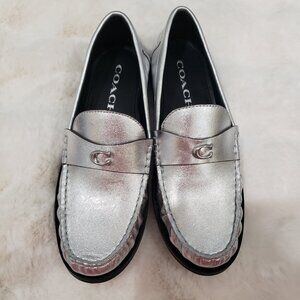 Coach Jolene Shiny Silver Metallic Penny Loafers Women's Sizes NEW Classic