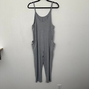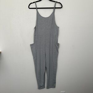 Stylish gray jumpsuit by Vuori. Features a sleeveless design with side pockets. Perfect for casual wear.