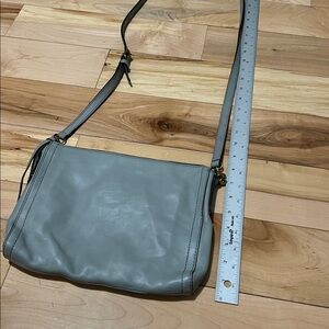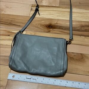 Stylish gray leather crossbody bag. At some points it looks like it has a bit of sage in it.. Perfect for everyday use. Features adjustable strap-crossbody. Leather in good condition with some signs of wear mainly creases.Strap in excellent condition. Interior is clean. Metal accents are nice and shiny.