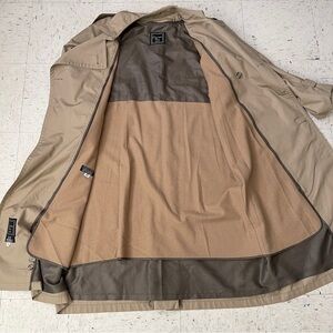 The Christian Dior Trench Coat in Tan, size 40 Regular, is a stylish and classic outerwear option for men. Made from a blend of polyester and cotton, this coat features a removable liner and a spread collar style. The belted closure and button accents add a touch of sophistication, making it perfect for formal or business occasions in the winter, fall, or spring seasons. The timeless design and designer brand ensure a high-quality garment that will keep you warm and fashionable for years to come.