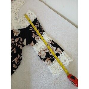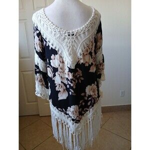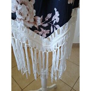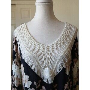 Crochet Fringe V Neck M short Sleeve Peasant Top Floral Tassels Lace Bohemian