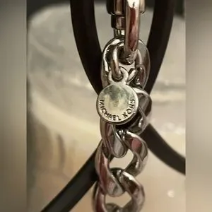 Elegant keychain with iconic Michael Kors logo. Features silver design. Ideal for keys or bags.