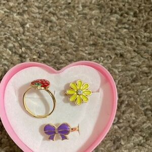 Delightful ring set for kids featuring a strawberry, daisy, and bow design. Adds a cheerful touch to any outfit.