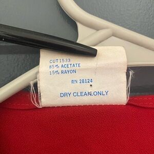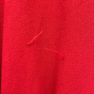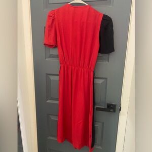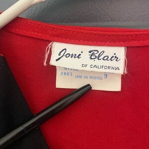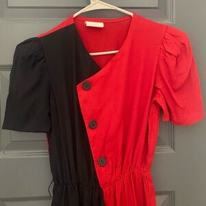 Super fun black and red 80s dress! The top 3 buttons are functional, the bottom ones are purely ornamental. The waistband hasn’t lost any elasticity and still has plenty of stretch left in it. There are small shoulder pads to emphasize the puff sleeves. There are 2 small snags (less than 1 inch each, shown in photo 6) on the back of the dress, they are not very noticeable.