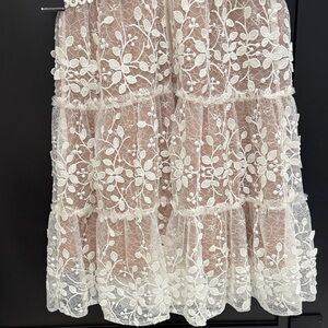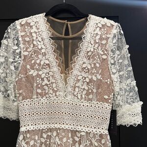 This elegant lace mini dress features intricate white floral patterns over a tan base, perfect for any special occasion. The delicate design and flattering fit make it a must-have addition to your wardrobe.
