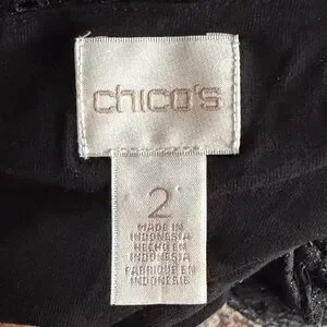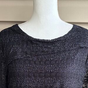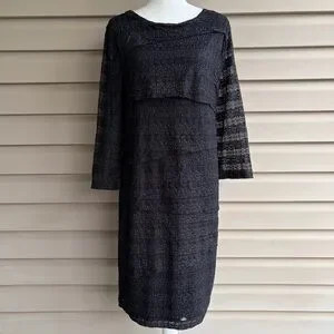 This is a lovely black long sleeved dress from Chico’s, ladies size Large (Chico’s size 2). The shell is a lace-like textured fabric, 98% nylon/2% spandex. The body is lined with black knit fabric that is 95% rayon/5% spandex. Features a rounded neckline, asymmetrical tiers on the front, and a subtle shimmer. A versatile addition to your wardrobe!