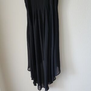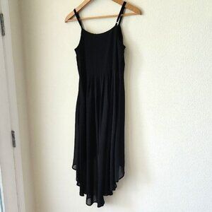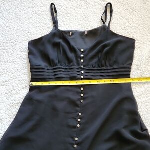 Black Slip Dress Camisole Straps High Low Hem silver tone buttons Pleated Waist
