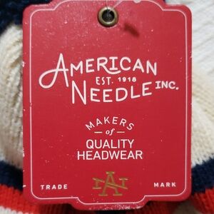 Stylish cream beanie with navy and red accents. Features a bold logo and playful pom-pom.