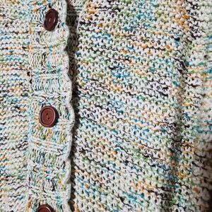 Vibrant knit cardigan with a textured pattern. Features a blend of cream with blues, green and colors for a chic look.