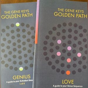 Set of two 'The Gene Keys Golden Path' books. Includes 'Genius' and 'Love' guides. Perfect for personal growth and exploration. You will want to get the basic workbook (see last two photos) to go along with volumes 1 and 2. These two books are unused and new, however there was a tiny bit of coffee spilled on volume 1 (at one end only, not on any inside pages), see photos.