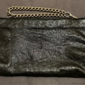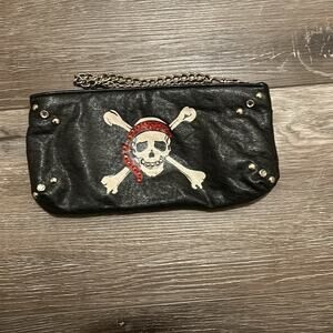 Stylish soft faux leather, black clutch with skull and crossbones Jolly Roger design. Features a chain strap and stud accents.