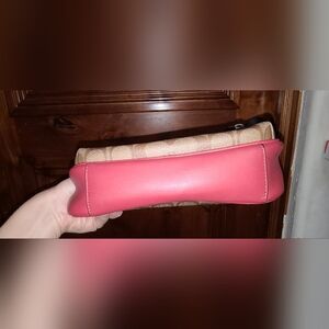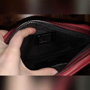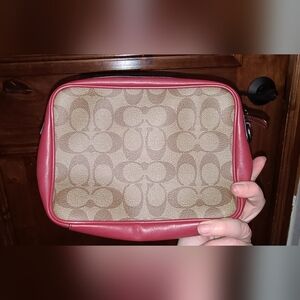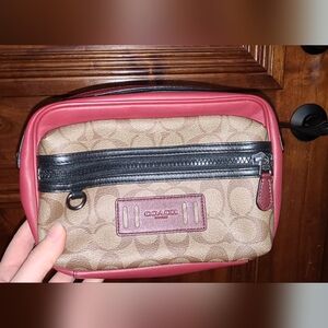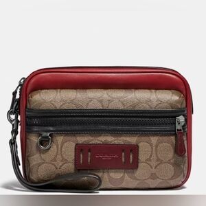 Elegant Coach toiletry bag with signature pattern. Features rich brown and bold red accents. Ideal for travel essentials.