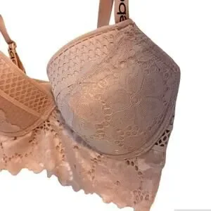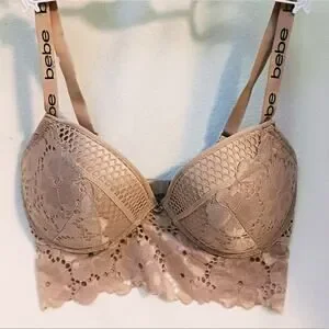 bebe Bustier 38C Lace Fringe Bustier Bra Bralette CHAMPAGNE DUSK Bra Lace Trim Edge w Sporty Straps