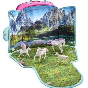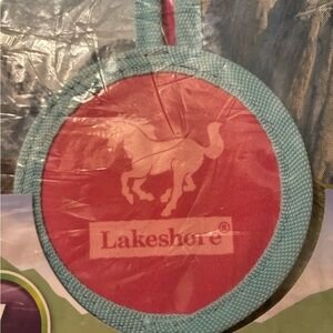 This vibrant Lakeshore carrying case features a playful pink and blue design, perfect for storing and transporting your child's favorite action figures and playsets. The colorful exterior adds a fun touch to any adventure. The perfect play-set for on-the-go adventures. Comes with 6 play horses, whole thing packs up into a neat backpack.