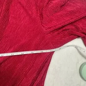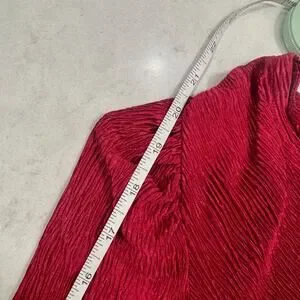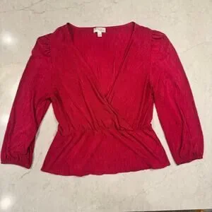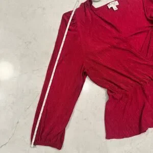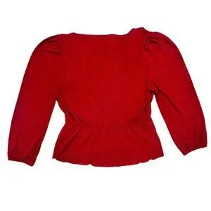 This romantic Morgan Taylor blouse is crafted in a rich sangria red tone with an intentionally textured crinkle finish that adds depth and movement. Designed with a surplice (wrap-style) V-neckline, it creates a flattering silhouette, while the elastic empire waist softly defines the shape and flows into a subtle peplum hem. The long sleeves feature gentle volume with elastic cuffs for comfortable wear. Lightweight and drapey, this top transitions easily from work to evening and is ideal for fall, winter, and holiday styling.
