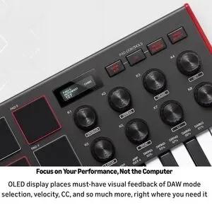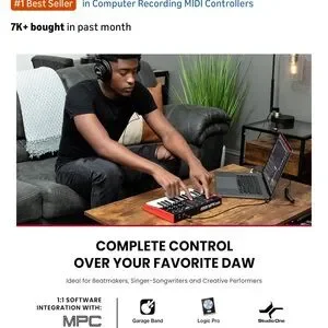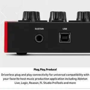 Compact and powerful MIDI controller perfect for music production, beat making, and studio work. Features 25 velocity-sensitive mini keys, 8 backlit MPC-style drum pads, and 8 assignable knobs for full creative control.